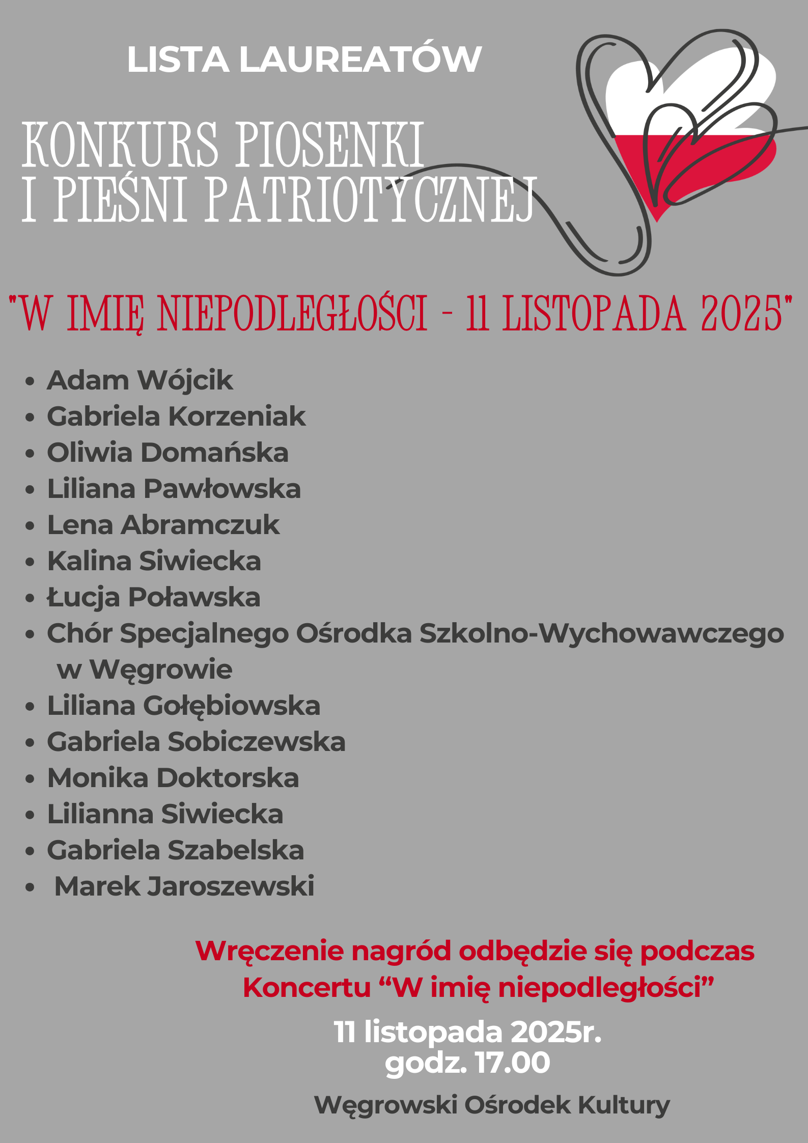 Wręczenie nagród odbędzie się podczas Koncertu 11 listopada 2025r. o godz. 17.00 w Węgrowskim Ośrodku Kultury.